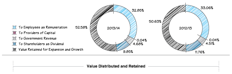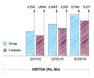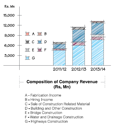 The Company has recorded the highest ever revenue which is Rs. 16.4 Bn at the Group level. Turnover at the Company level stood at Rs. 13.2 Bn, towards which the highways construction sector contributed 58% followed by 25% from building construction and piling and 7% from water and drainage construction. A noteworthy improvement was made in 2013/14 in the bridge construction sector compared to 2012/13 with a 6% contribution to the top line mainly on account of Veyangoda Railway Crossing Flyover and Polduwa Bridge.