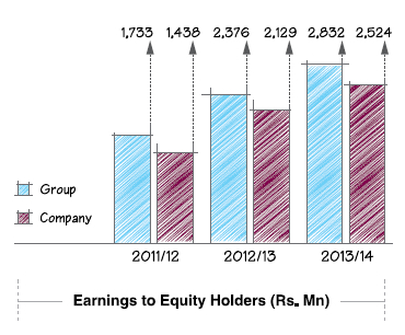 During the period under review, earnings before tax increased by approximately 25% and 22% at Group and Company level stemming from the top line growth and the rise in gross profit. Growth in gross profit of 37% and 26% at Group and Company respectively is also noteworthy. The effective tax rates at Group and Company level were approximately 13% and 10% respectively due to the Company and its fully owned subsidiary - Access Realties (Private) Limited being on concessionary tax rates of 12% on construction income and 2% on revenue. This resulted in a growth in profit after tax of 20% and 19% respectively at Group and Company levels compared to the previous year to register at Rs. 2,899 Mn and Rs. 2,524 Mn. After tax profit attributable to shareholders of Rs. 2,832 Mn and Rs. 2,524 Mn respectively at Group and Company levels, recording growth of 19% and 19% over the corresponding period. Based on reported results, net profit margins were approximately 18% and 20% at Group and Company levels, which are well beyond standard margins of the construction industry the world over. Earnings per share were Rs. 2.83 and Rs. 2.52 at Group and Company levels.
