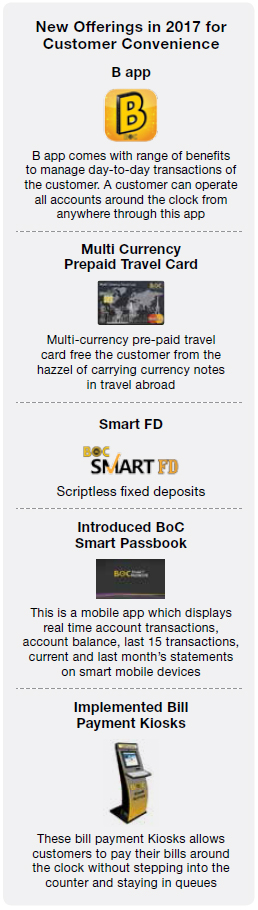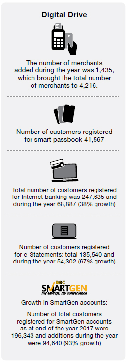 With the trends in customer preferences, digital banking will continue to be in the forefront of our strategy in 2018. “IT and Cyber Security” has also been identified as a focus area in the strategic plan. The technological infrastructure of the Bank needs to be updated to keep up with the demands of the millennial customers. While technology brings opportunities, it also brings threats. We have to ensure that our data, systems and networks are secured to the highest possible degree. Strategies have been developed to acquire the latest technological advancements to the Bank with the view of providing realistic total virtual banking experience to the customers. Going forward, the Bank will expand its Branch-on-Wheels mobile branch initiative to all provinces, and will open digital branches. Furthermore, we will continue automating business processes, and introduce new products over the course of the next year.