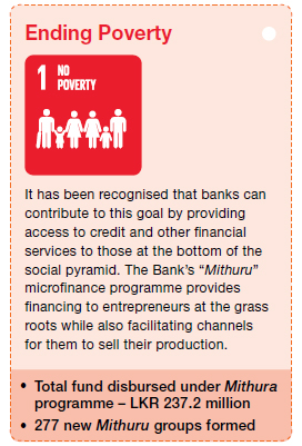 Mithuru microfinance programme is conducted via bank funds. During the year the Bank has disbursed LKR 237.2 million funds for this programme and 277 Mithuru groups and 10 Mithuru societies were formed. The Bank also helped the entrepreneurs developed via Mithuru societies to sell their products through Mithuru pola arranged by the Bank. As at end of 31 December 2017 there were 18,250 registered Mithuru groups and 444 registered Mithuru societies.