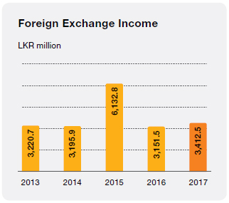 The year 2017 was an extremely successful year for the BoC Treasury. Achieving almost all of its goals, Treasury optimised on the opportunities emerging from the changes in exchange rate. As a result an impressive foreign exchange profit of LKR 3.4 billion was posted by December 2017. Some initiatives which were designed and implemented to expand the Treasury functions such as expanding the corporate desk, introducing a competitive pricing mechanism, aggressive foreign exchange trading, expanding relationships with exchange houses and system enhancement were all instrumental in achieving the better results.