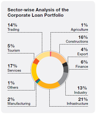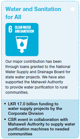 However, the Bank continued its support to Government and State-Owned Enterprises by way of long-term finance for large infrastructure projects as well as financing short-term funding requirements. During the year, funds totalling LKR 17.0 billion has been disbursed towards financing water supply projects while a further sum of LKR 1.7 billion has been disbursed to finance road rehabilitation projects. In addition, the Bank has agreed to finance a sum of approximately LKR 10.0 billion towards infrastructure development projects to be initiated by the Ministry of Health.