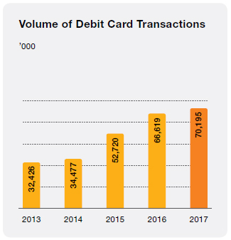 The Bank of Ceylon credit card is accepted at more than 6,000 outlets in Sri Lanka and 20 million merchants worldwide. The same applies to our debit card which has a dual functionality as an ATM card, and ensures prudent spending. A total of 15,684 credit cards and 883,939 debit cards were issued in 2017. During the year, the increase in total number of credit cards and debit cards were 12% and 18% respectively.