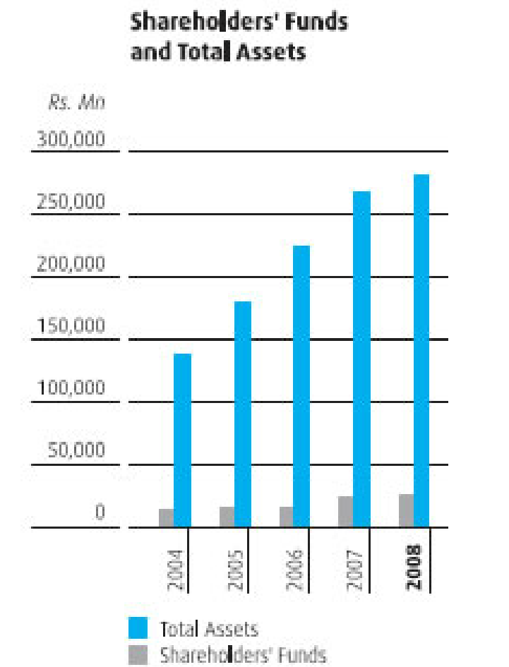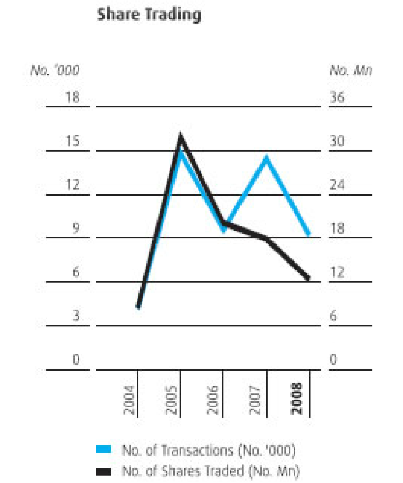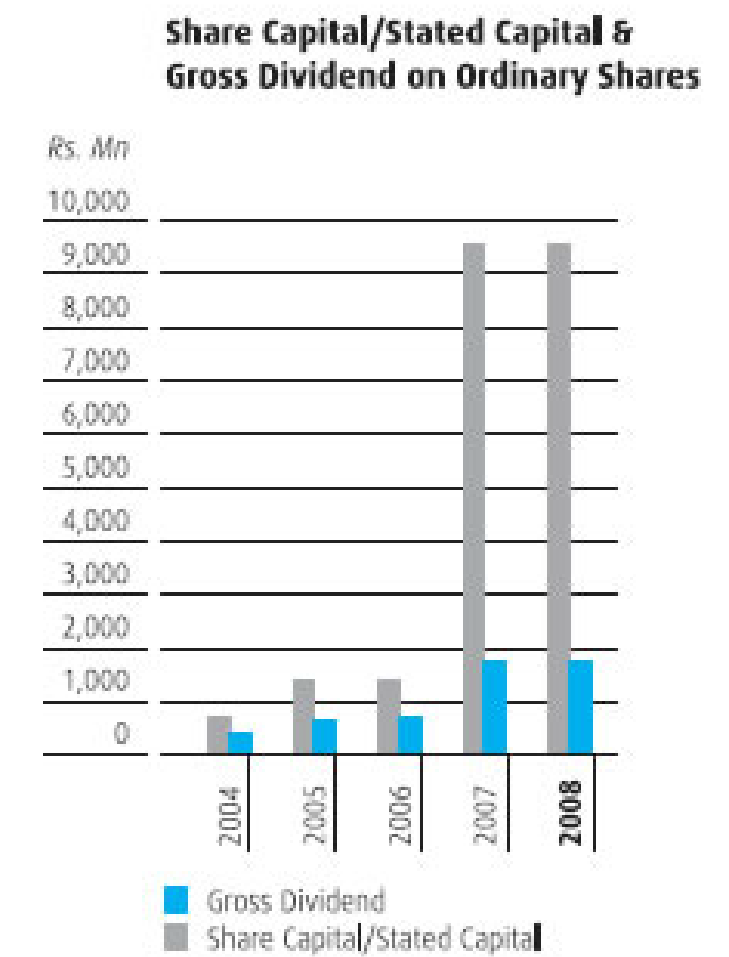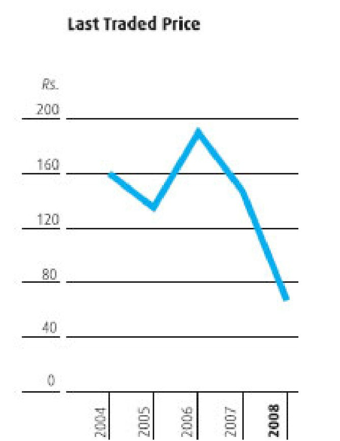 in 2008 and in Bangladesh the Bank was upgraded to a AA+ rating by Credit Rating Information Services Ltd. The Bank’s share was subject to huge variations as a result of a volatile market in Sri Lanka and fluctuated between a low of Rs. 66.25 in December 2008 to a high of Rs. 149.75 in January 2008. It ended the year at Rs. 67.00.
