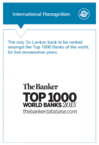 Rated the Most Respected Bank in Sri Lanka for the 11th consecutive year and the Second ‘Most Respected’ Corporate Entity in the country overall for the fifth successive year in 2015 LMD rankings of the Most Respected Entities in Sri Lanka. |