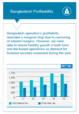Bangladesh operations recorded a substantial credit growth of 23% amidst the lackluster demand for credit as some corporates deferred investment in the market due to political unrest. Excess liquidity in the market resulted in reducing interest rates, however, our Bank recorded an impressive deposit growth of 18% during the year. Client acquisition initiatives were successful with deposits diversifying further, reducing the dependency on the top 50 depositors and auguring well for growth in the future. Total operating income declined due to pressure on margins as interest rates declined exacerbated by reduced import and export turnover. Credit quality deteriorated throughout the industry which has been a key area of focus for improvement through increased rigour in monitoring. The cost to income ratio of Bangladesh Operations decrease by 3.17% to 24.98% for 2015.