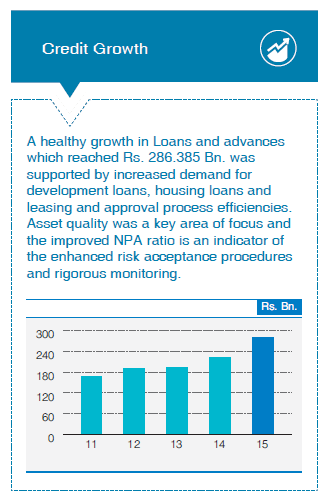 The CBSL continued to maintain its relaxed monetary policy stance during 2015, with several adjustments to provide the necessary impetus to economic activity facilitating credit flows to the private sector. Overnight interest rates moved upwards and settled close to the lower bound of the policy rate corridor with the removal of the restriction on access to CBSL’s Standing Deposit Facility (SDF) in March 2015. The CBSL reduced its Standing Deposit Facility Rate (SDFR) and Standing Lending Facility Rate (SLFR) by 50 basis points each in April 2015 to 6.00% and 7.50% respectively in response to intermittent increase in interest rates in certain market segments following the removal of restrictions on the SDF and also the sharp decline in inflation and they remained at these levels throughout the year. These measures resulted in a surge of demand in private sector credit in the latter half of the year with credit growth outstripping deposit growth after the lapse of many years. The resultant normalising of excess liquidity in the market also added pressure on interbank rates, AWDR and AWPLR which moved up during the same period. The Bank’s ALCO was compelled to revise both lending and deposit rates upwards although the NIM reflects a marginal decline given the intense competition in the market for private sector credit and related business.