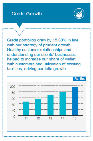 Portfolio growth was robust at 15.69% closing the year at Rs. 180.628 Bn. driven by increased demand for credit particularly in the latter half of the year. Tourism and leisure in Sri Lanka and Maldives were the key sectors of growth for corporate banking in addition to health care, Non Banking Financial Institutions and Consumer Durables as loans disbursed to these sectors increased during the year. The Bank’s focus on its core areas of innovation, professionalism, service quality and optimising earnings enabled us to further strengthen our leadership in vital segments supporting growth. Customer acquisition and retention was key to our growth strategy and success in this area is attributable to effective relationship management, a strong franchise, our ability to customise solutions to customers using a wide range of products and streamlined operations backed by reliable IT.