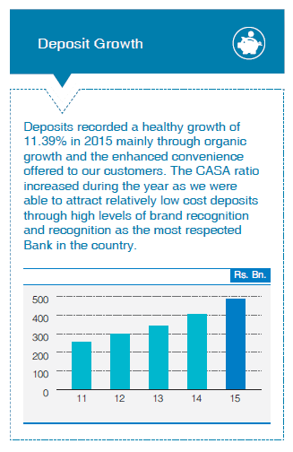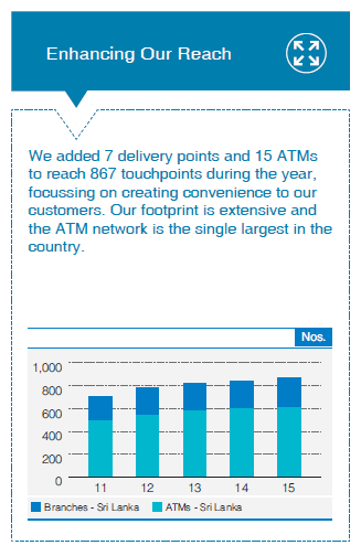 The Bank is also well-positioned to grow its remittance volumes through increased digitisation and a growing presence in key migrant markets. As the pioneer local Bank to introduce its own electronic instance remittance service product to Sri Lanka in 2003, the Bank has now set up all the necessary strategies to become the first ever Sri Lankan Bank to introduce itself as a Remittances Service Provider (RSP) with a global product in 2016.
