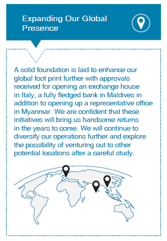 2015 has been a year of success for expanding our global footprint to Myanmar, Maldives and Italy. Each location provides a unique opportunity for growth, matching our strengths with perceived opportunities in the market identified after careful study. Consequently, our proposals for growth include an SME strategy for Myanmar, a high tech strategy for Maldives and an exchange house in Italy.