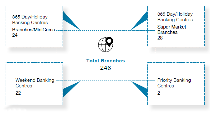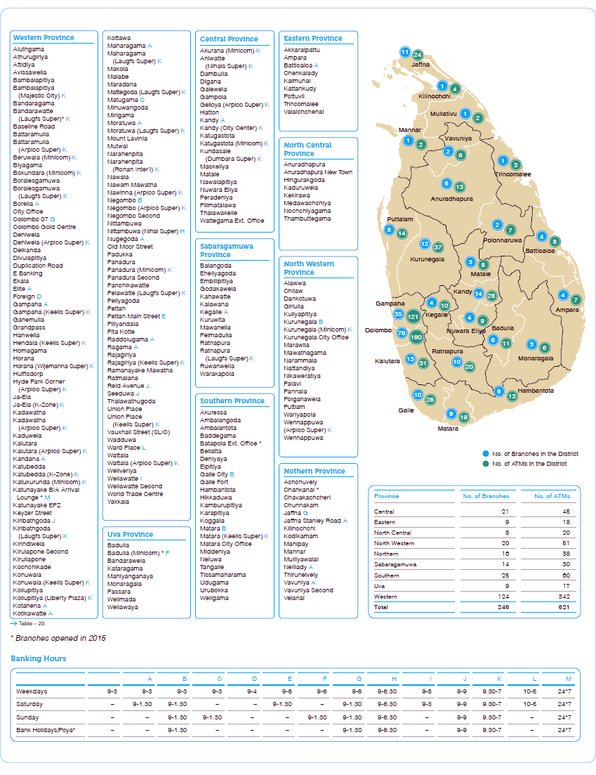 We have grown our network of branches and ATMs to 246 and 621 respectively totalling to 867 owned customer touchpoints in Sri Lanka facilitating ease of access to financial services. Strategic partnerships with institutional partners and connectivity with the common switch, takes our total customer touchpoints to an unparalleled 1.9 Mn. ATMs across over 200 countries. Our branches have also extended banking hours for the convenience of customers in identified locations which received a favourable response. Consequently, we converted a total of 52 branches to 365-Day Banking Centres and a further 22 to Weekend Banking Centres. Details of locations of branches are given on Figure 19 & 20 and Table 23. Branches outside the Western Province have grown during the year facilitating increasing penetration of financial services. Establishment of two Priority Banking Centres located in premium residential areas has enabled us to cater to a high net worth clientele, ensuring our accessability to all customers.