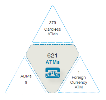 The ATM network (Table 23 & Figure 21) was upgraded to provide deposit facilities at nine locations and we expect to have the entire ATM network converted to Automated Deposit Machines (ADM) in the coming years. The number of cardless ATMs increased to 379 and was an innovation focussing on customer convenience. In November 2015, we opened an Automated 24/7 Banking Centre at the Ward Place Branch which is the first of its kind in the country, expanding the services available 24/7 to encompass opening of savings accounts and fixed deposits, access to online banking, settlement of credit card dues, as well as cash and cheque deposits with additional functionality planned in the future to encompass even submitting loan application.