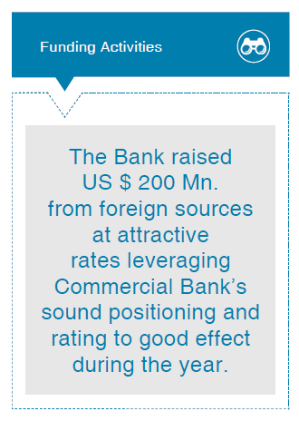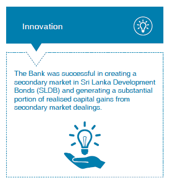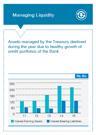 Managing the funding operations of the Bank, the Treasury division continued to support the retail and corporate banking units in their LKR funding requirements whilst managing the foreign currency flows arising out of their business. Considered as a significant player in Interbank FX and Fixed Income Securities market, our operation is segregated into Treasury Sales, Fixed Income Trading, Interbank & ALM and oversees the – operations of the Bangladesh branch Treasury with guidance from the ALCO. The Treasury also effectively managed the Bank’s Interest Risk, Liquidity Risk and the Foreign Exchange Risk in a year which saw movements in both exchange and interest rates and ensured adequate margins.