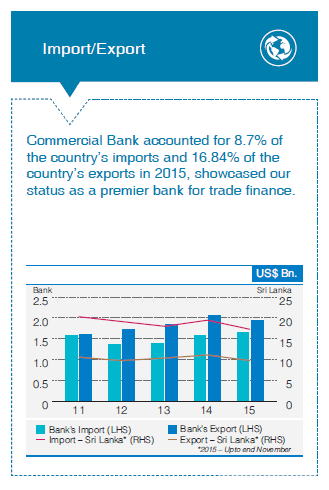Total operating income increased by Rs. 355.008 Mn. as volume growth in portfolio and trade finance offset narrowing interest spreads and margins on fee-based income. Import and export turnover was driven by encouraging higher utilisation of established limits with existing customer and targeted client acquisition. Import turnover increased by 4.2% in US$ terms during the year as import of vehicles and consumer goods increased and our market share in key import segments increased. Export turnover of the Bank recorded a marginal drop in US$ terms in line with the drop in volumes of exports of the country for the first nine months of 2015. Substantial market share of imports and exports providing undisputable evidence to our expertise and customer satisfaction in this vital aspect of corporate banking.
