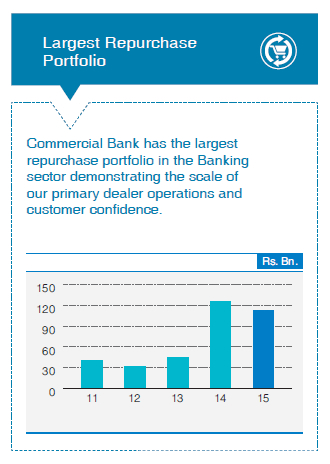 The use of debit cards in Sri Lanka increased by 31.6% with credit cards spending growth moderating to 10.7% as reported in the Payment Bulletin for the 3rd quarter of 2015. Notably, the number of debit card transactions has exceeded the credit card transactions for the first time in 2015 although the value of transactions in credit cards remains higher. The number of POS terminals in the country also increased by 17.8% to 38,600 as at September 30, 2015 facilitating card transactions. ATM transactions in the country also increased by 15.5% in volume and 32.3% in value as at September 30, 2015. Commercial Bank’s licenses across the entire range of card services as an issuer of credit, debit cards and as a financial acquirer of payment cards provides scope and agility for growth in this lucrative segment.