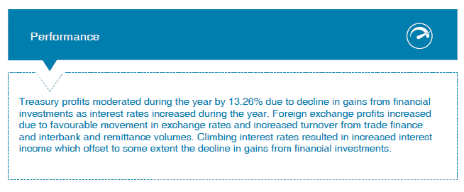 The Bank’s forex profit was strongly supported by increased volumes of import export business and remittances. Notably, The Bank’s Treasury was the market leader in Interbank FX Operations, providing liquidity in spot, forward and swap transactions.
