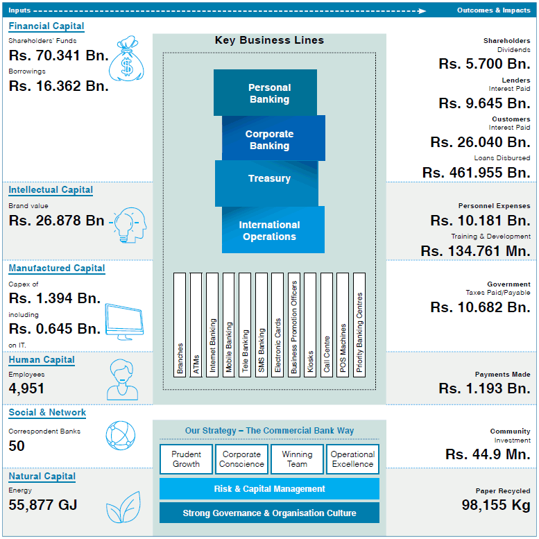 Commercial Bank has a proud history of creating value for our stakeholders over 90 years as evinced by our market capitalisation, our deposit and loan portfolio growth, employee retention rates and growth of our footprint. Over time, we have developed our strategy, ‘Commercial Bank Way’, which encapsulates our commitment to sound principles, values and objective decision-making process supported by expert analytics. We are a prudent Bank committed to long term relationships with a deep understanding of our role as custodians of wealth, impacting many lives directly and indirectly by facilitating trade and providing access to finance. As key partner in growth to over 3 million customers, we play a key role in the socio-economic progress of Sri Lanka and Bangladesh and our strategy reflects this role that entrusted with great responsibility. Our Business Model provides an overview of how we transform our capitals in to value for our key stakeholders.