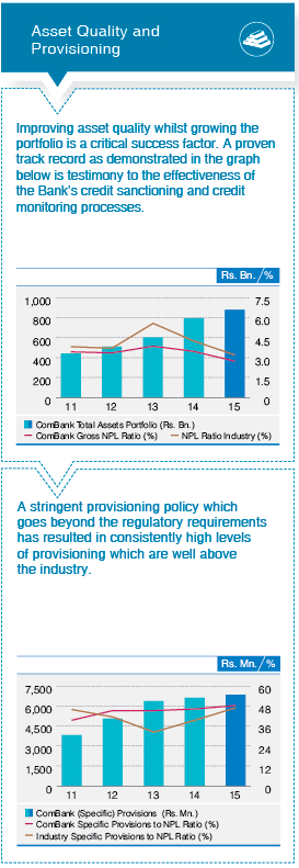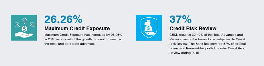 - Segregation of Credit Risk Management Functions – Credit risk management comprises three functional components with pre-sanction risk being monitored and evaluated by Credit Risk Management, post-sanction credit risk being monitored by the Credit Risk Review Function and the social and environment risk being monitored by the Environmental Risk Review Function. This facilitates a high degree of specialisation and honing of skills resulting in focussed and effective analysis supporting effective credit risk management. The Credit Risk Review Function has reviewed borrowers with an exposure upto 37% of total loans and receivables portfolio of the Bank during 2015.