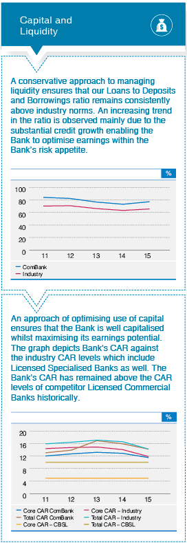 Capital Management is a key focus area for the Board, who approves the Internal Capital Adequacy Assessment Process (ICAAP) and submissions to the CBSL in this regard. The Board and the BIRMC are monitoring the progress on the Bank’s implementation of ICAAP. They have participated in several presentations to fully understand the impact of developments in this regard and the related benefits, risks and opportunities. Additionally, external consultants have been engaged at the initial stages to facilitate a smooth transition and build capacity within the Bank.