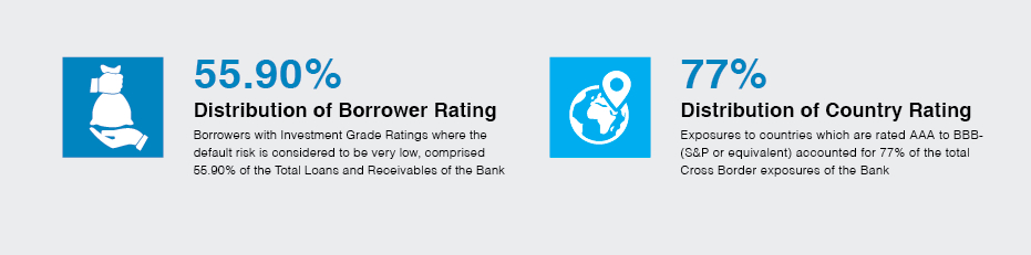 Credit Risk is defined as the potential loss that could arise if a counterparty or customer fails to meet an obligation under a contract. It arises mainly from direct lending activities which are reflected on the Balance Sheet and from transactions facilitating trade such as Letters of Credit, Guarantees, Documents Against Acceptance etc., which are Off-Balance Sheet. Credit risk is comprised of counterparty risk, concentration risk and settlement risk.