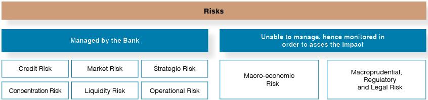 Our business is exposed to a number of risks which have the potential to impact our ability to achieve pre-determined strategic goals including our financial performance. Whilst some risks can be managed by the Bank, there are other key risks that need to be monitored in order to assess their impacts although the Bank is unable to manage these risks (Figure 15). These include the following: