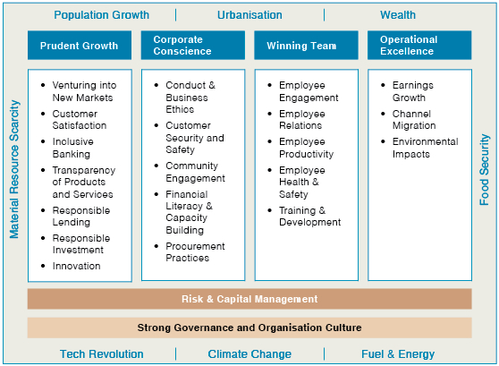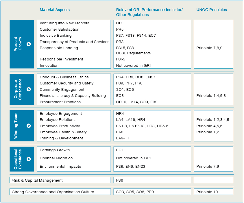 The process continues to evolve as we seek to increasingly adapt to a leaner style of reporting and communication. This year, we have framed the issues in our terminology and then mapped them to the aspects of the GRI G4 guidelines. Consequently, there are issues that are not included in the GRI G4 Guidelines, which we have included as material topics. Reconciliation of material topics to aspects identified in the GRI G4 Guidelines and UNGC principles is given on Figure 5 below. We also considered the mega trends impacting businesses globally and locally to understand both the opportunities and risks they present to the Bank and these have been mapped around the material issues to complete the picture.