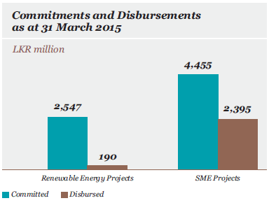 In March 2014, the Government of Sri Lanka appointed DFCC Bank to administer the EIB-funded EUR 90 million Sri Lanka SME & Green Energy Global Loan scheme. DFCC Bank is also one of the three intermediary banks participating in the scheme. Renewable Energy and Energy Efficiency investments will receive 30% of the loan with the balance 70% for investments in SMEs. The credit line funds up to 50% of eligible investment costs in LKR or USD at an attractive fixed interest rate for up to 15 years. The take up has been excellent during the first year of operation with 7,002 million (46%) of the credit line committed for 84 projects by 31 March 2015. Disbursements during the period amounted to 2,585 million.