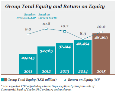 Return on equity for the current year was 10%. The equity of the Group is significantly augmented due to the recognition of unrealised gains on listed ordinary shares and Government securities classified under ‘available-for-sale’ as required under SLFRS and the resultant increase in equity on 31 March 2015 is LKR 15,113 million. The return on equity will improve to 14% if this unrealised gain is not taken into account.