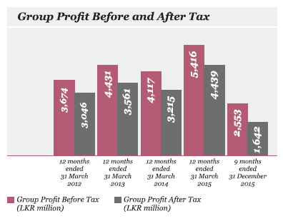 Dividend per share for the nine months ended 31 December 2015 is LKR 2.50 per share compared to LKR 6.00 per share in the previous year. The decrease in the dividend is mainly due to the financial results for the period being for a contracted period of nine months.