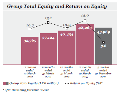 Return on equity of the Group for the period was 4%. The equity of the Group is significantly augmented due to the recognition of unrealised gains on listed ordinary shares and Government Securities classified under available-for-sale as required under SLFRSs and the resultant increase in equity on 31 December 2015 is LKR 11,858 million. The return on equity will improve to 5.6% if this unrealised gain is not taken into account.