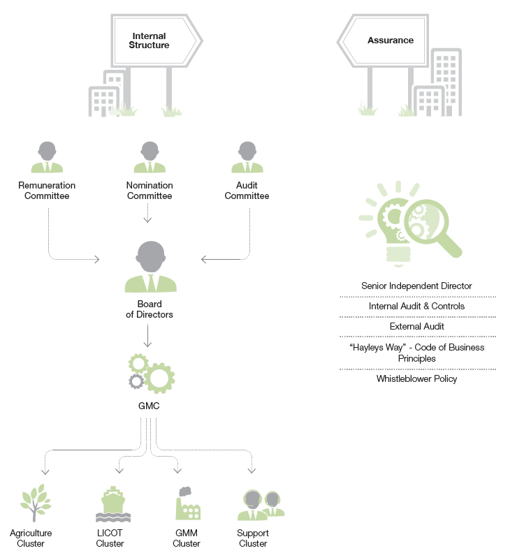 Internal governance encompasses the system of policies, processes and rules established by the Hayleys Board of Directors for the business to follow. It includes the reasons for which the Group operates and the roles various stakeholders play in pursuing and achieving those goals. Hayleys internal governance structure and assurance framework is outlined in the diagram given below.